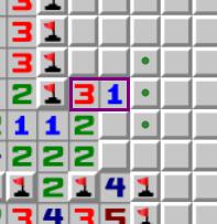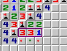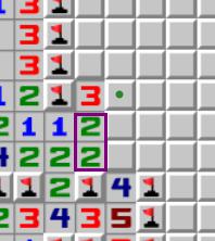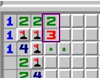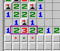 紫框中的2332,每个数字周围都有1个雷通过其他方式判出,因此真实数字为1221。